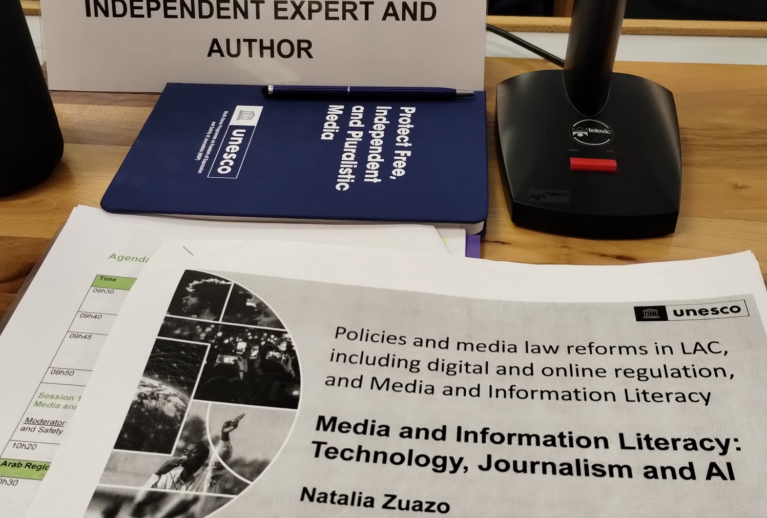 En el inicio de la Conferencia Global «Internet for Trust: Hacia unas directrices para regular las plataformas digitales para la información como bien común«, organizada por la UNESCO en París entre el 21 y el 23 de febrero de 2023, Natalia Zuazo -consultora de UNESCO para América Latina y el Caribe- participó en sesiones previas de trabajo con colegas de todo el mundo para compartir experiencias en lo realizado en alfabetización digital, inteligencia artificial y desinformación.