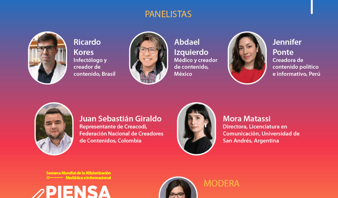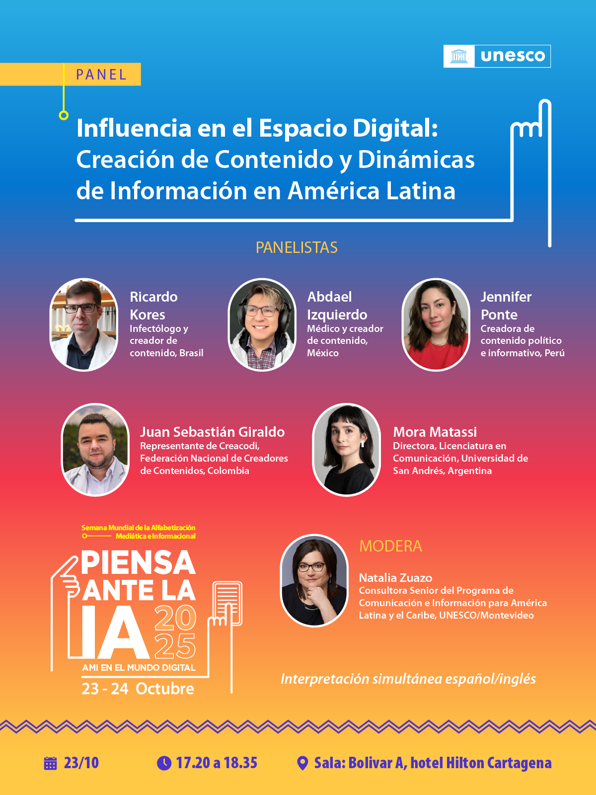 El próximo 23 de octubre, durante la Semana Mundial de Alfabetización Mediática e Informacional (MIL Week 2025) organizada por UNESCO en Cartagena, tendré el honor de moderar el panel “Influencia en el espacio digital: creación de contenido y dinámicas de información en América Latina”.